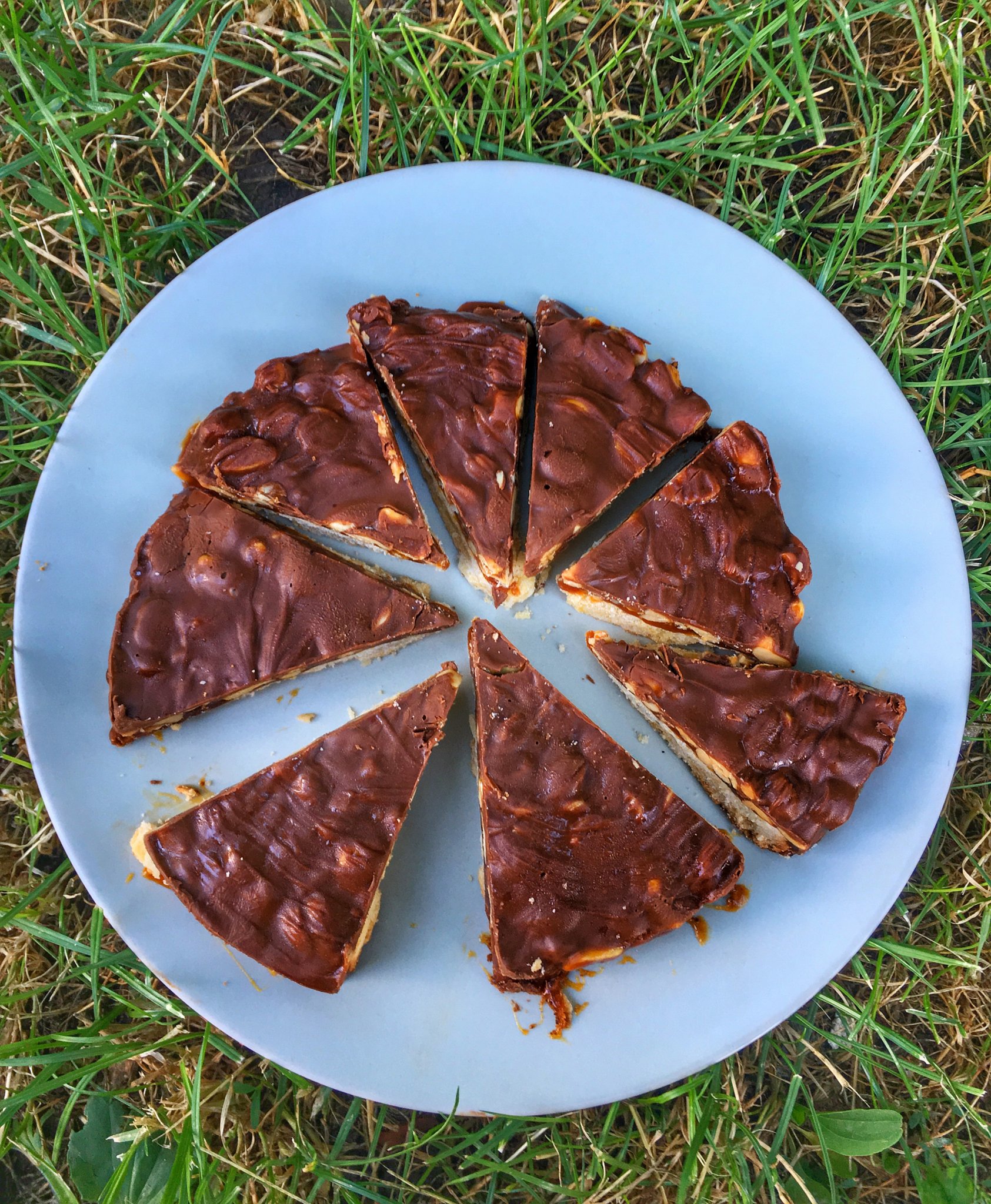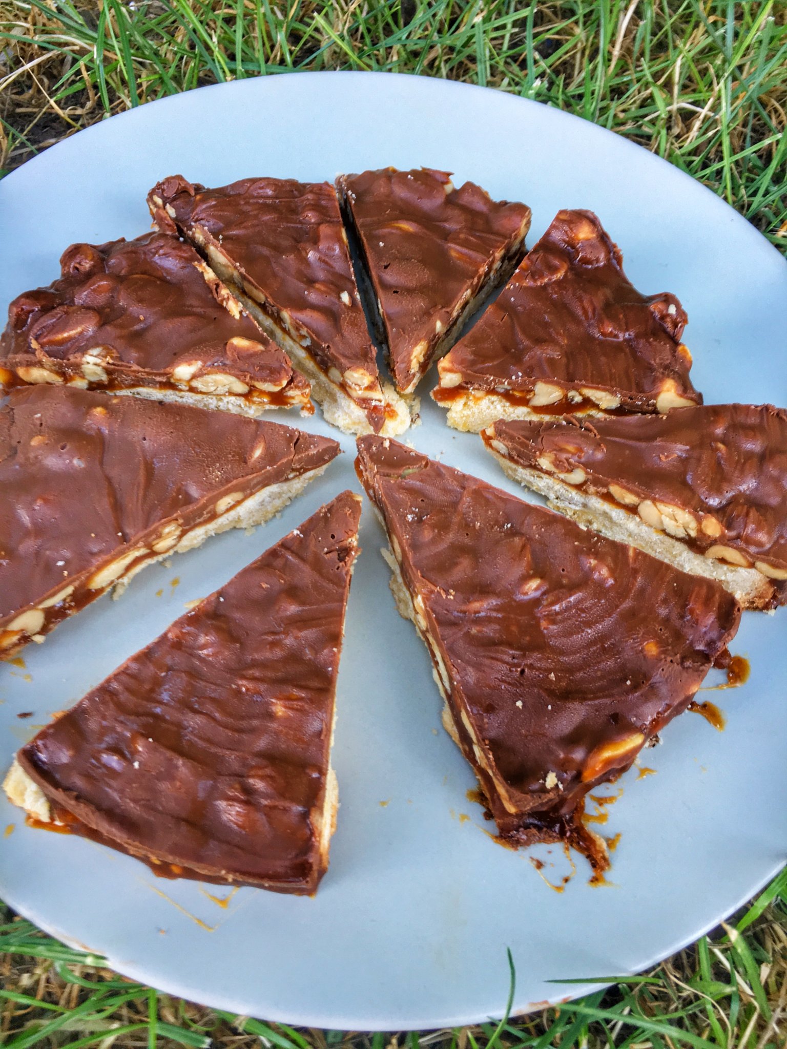 - A csokit ráöntjük a karamellás mogyorós rétegre és egy ecsettel elegyengetjük rajta .