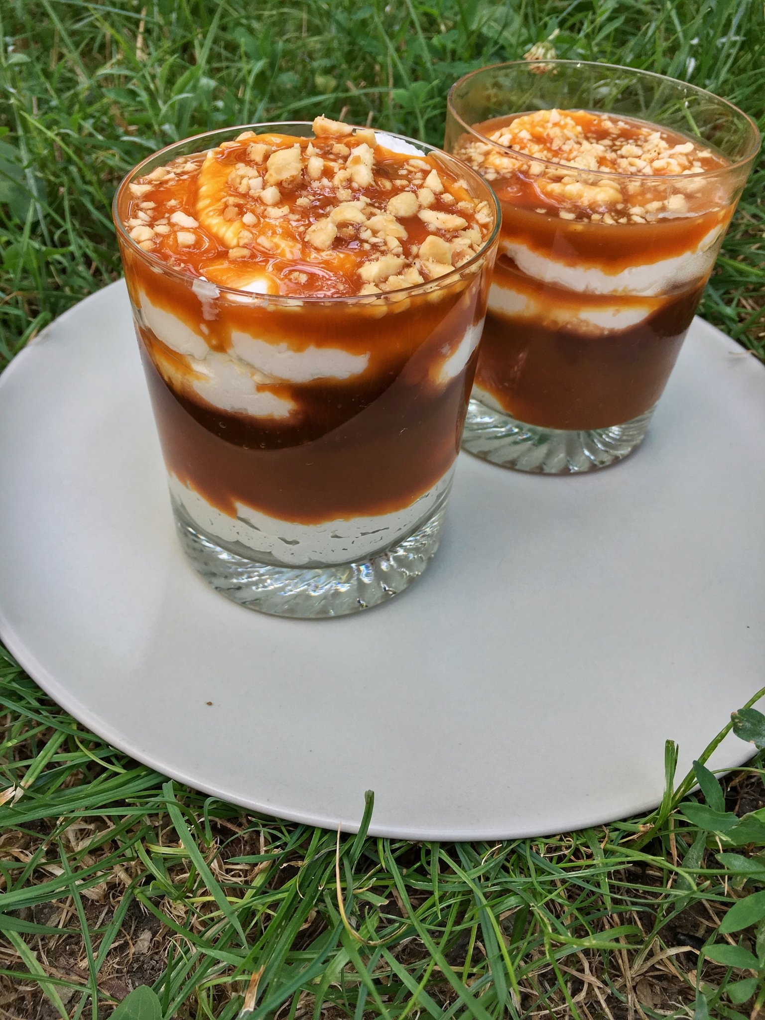 A lapokat megkenjük a krémmel , meglocsoljuk a karamellszósszal , valamint megszórjuk mogyoróval .
