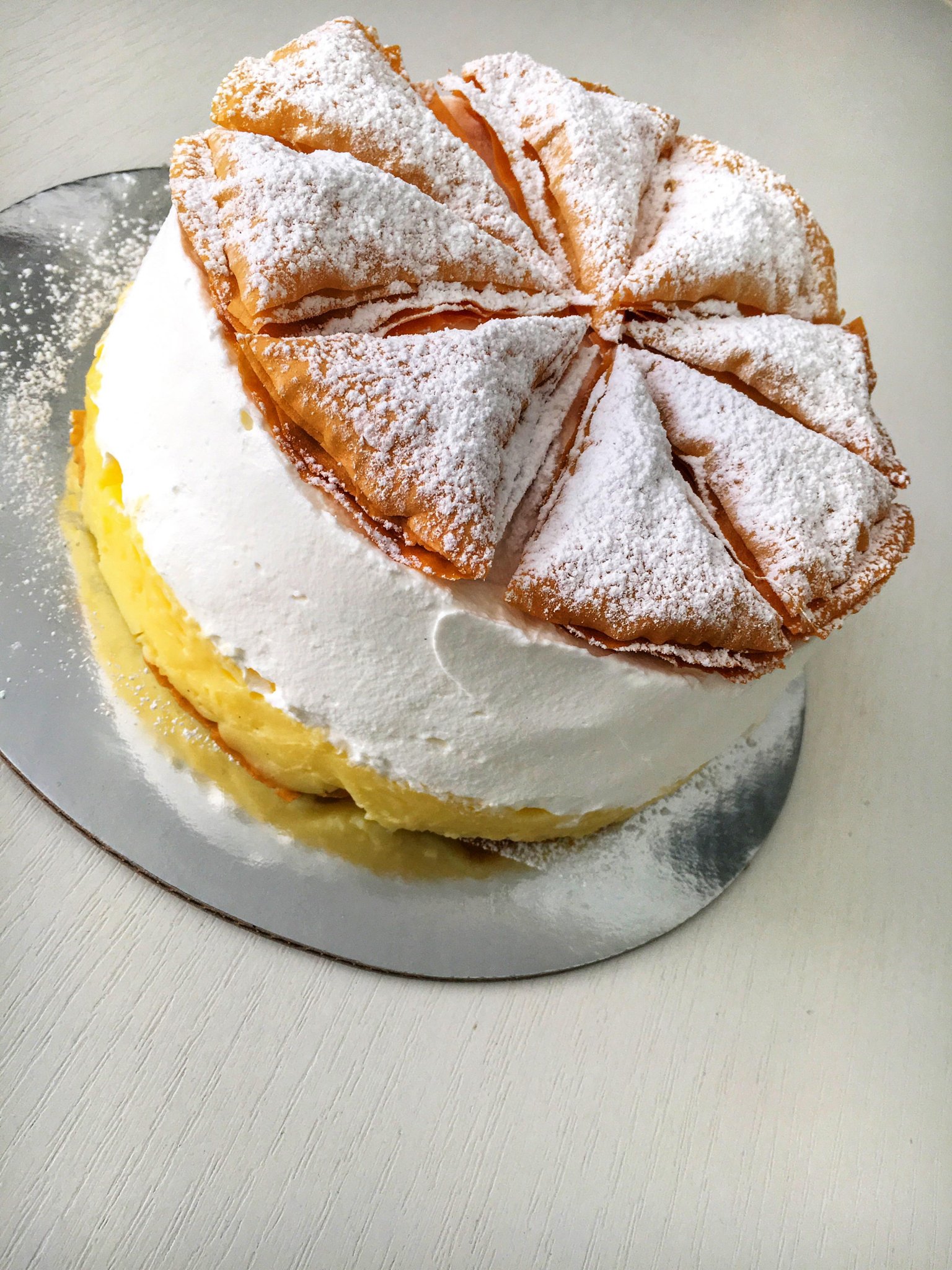 Valószínűleg a krémes szeretőket ki fogom most akasztani , de a megszokott leveles tésztás alapot én leváltottam ebben a receptben rétestésztára , ugyanis szerintem sokkal ropogósabb , és jobban is passzol magához a tortához . A jellegzetességeit a sütinek próbáltam megőrizni , de azért itt ott változtattam néhány dolgon még . A tejszínhabba került még mascarpone is , amitől sokkal gazdagabb , testesebb ízt kap a tortánk .