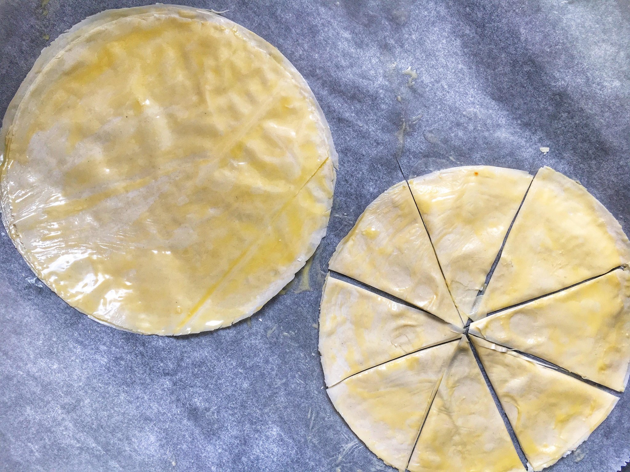 A tetejére szánt réteslapokat érdemes a sütés előtt felszeletelni . Ugyanis ha a sütés után akarnánk megcsinálni , már csak annyit érnénk vele , hogy darabokra törnénk , szóval mindenképp előtte tegyétek meg 🙂